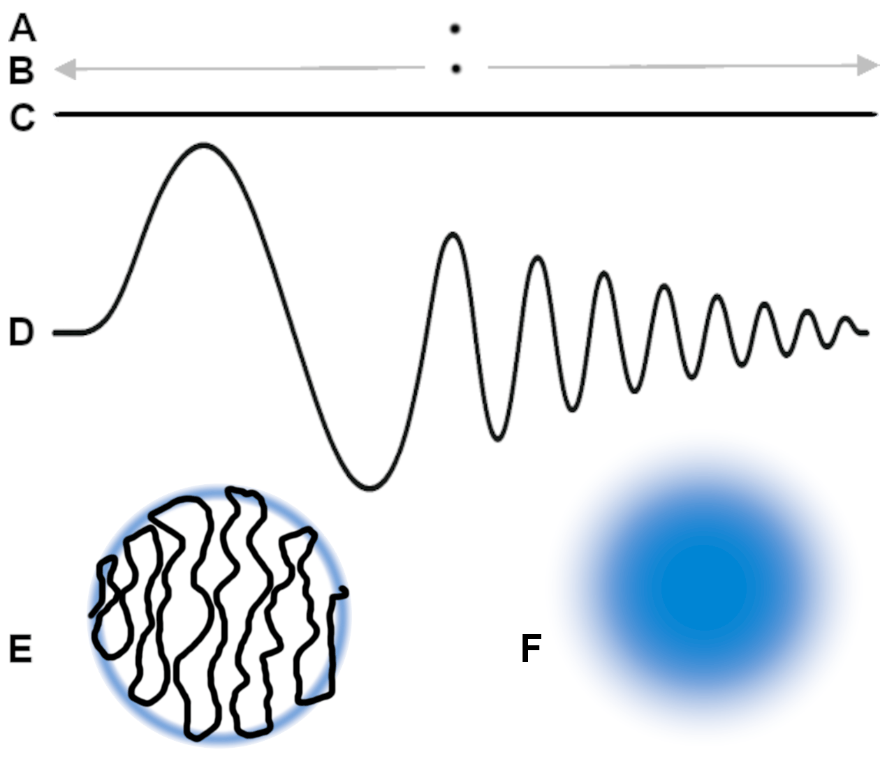 Imagine you have a point, as in Figure 1, (A). Move that point back and forth fast enough (B) so that it looks like a line, as in (C). Now take that imaginary line, grab one end of it and shake it up and down. You will get a wave, like (D). Add some chaos into your wave shaking, and you might get a string balled up into a circle (E). That circle can influence other particles and can be visualized as a fuzzy sphere, like (F).