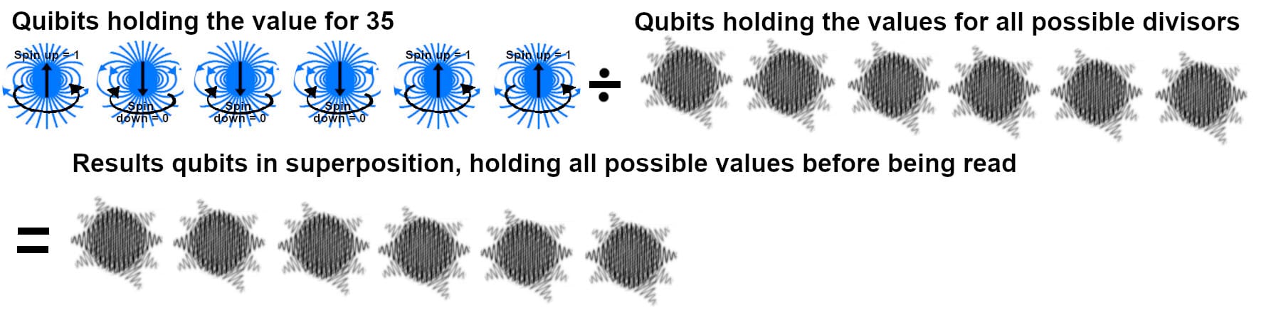 Two in binary is 010, and four is 100. You need three qubits to hold each of those numbers and three more to hold the answer. All three answer qubits start out in superposition as both 0 and 1. When you begin the math to divide 100 by 010, the three answer qubits are ### (if # means 0, 1 and everything in between). When you finish the math and go to read the answer, none of the possible answer qubit value waves (as illustrated in figure 2) are in sync except 010 so everything else falls away. 010 can be seen briefly as spin down, spin up, spin down in the three qubits. The qubit-reading circuits read those values and save them in conventional computer memory.
