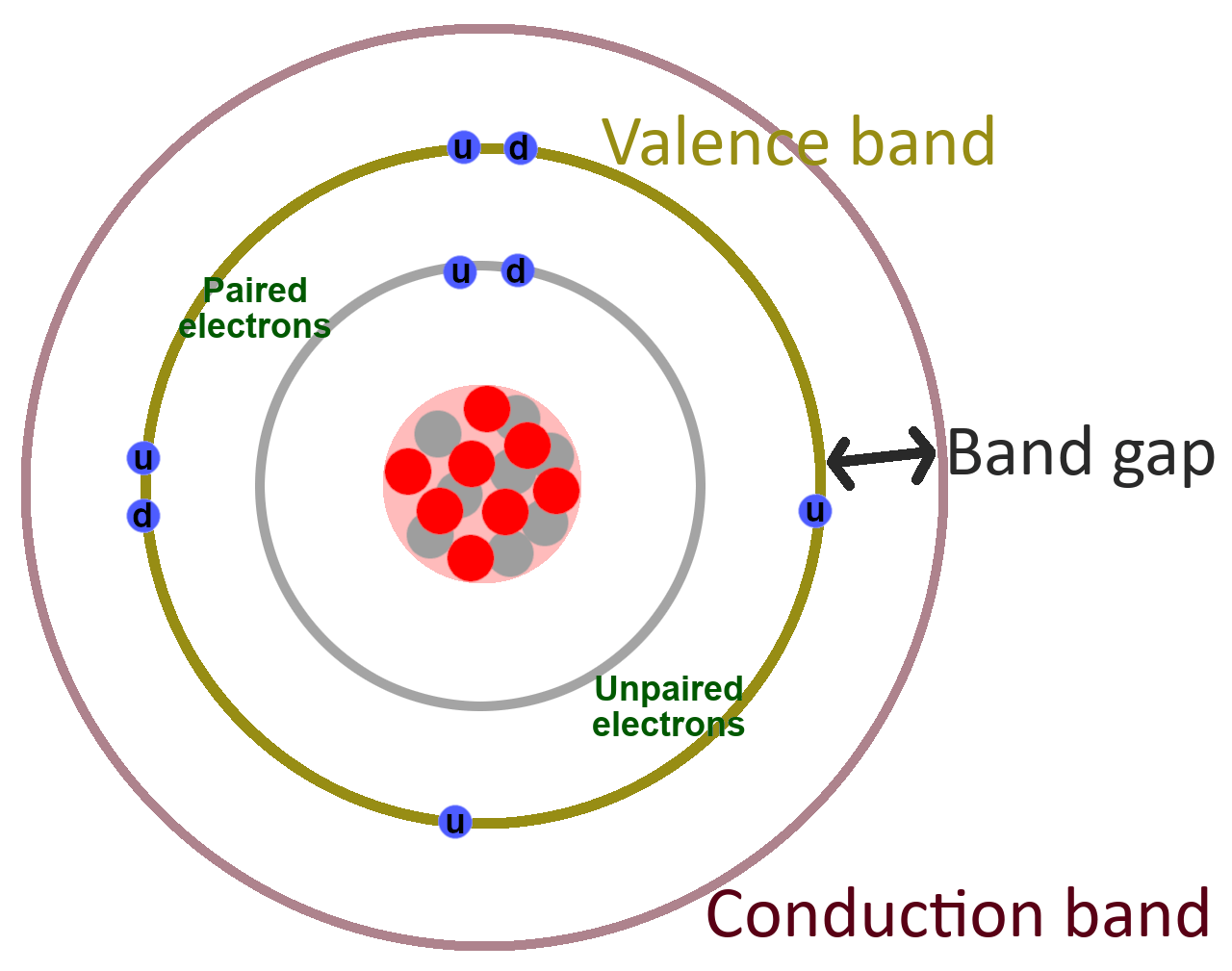 There is another band, called the conduction band, that is at or past the valance band. Electrons must be in the conduction band in order for the material to conduct electricity, but in many atoms, the conduction band is farther away from the nucleus than the valance band, so it doesn’t naturally have any electrons.